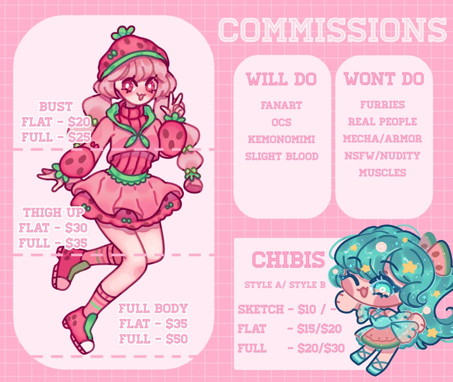 • Do not send me any payments before I confirm that I have accepted your commission. Unauthorized payments via paypal or ko-fi will be considered as donations. Ko-fi commissions are exempt from this bc they are pay as you order.• Full payment is required before I start working on a commission. Partial payment plans can be discussed if the commission reaches a certain price ($70 and above)• Payment will be PayPal only via invoice or ko-fi depending on the commission• No refunds once I start drawing/finish the commission• Refunds will only be given if I cannot finish it due to personal reasons• Any extra amount paid from the agreed upon price/minimum price will be considered as tips and also non-refundable once the commission is finished.